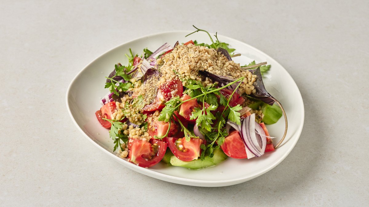 עגבניות מגי, מלפפון, בצל סגול, בזיליקום ואגוזי מלך