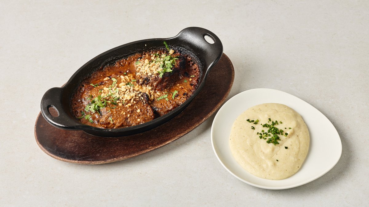תבשיל בקר, עגבניות ואגוזים, מוגש עם פולנטה רכה של קמח תירס לבן, חמאה וגבינת סולוגוני