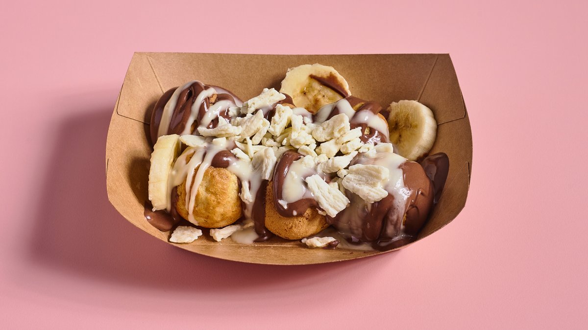 כדורי פנקייק, נוטלה, שוקולד לבן, בננות ומקופלת לבנה