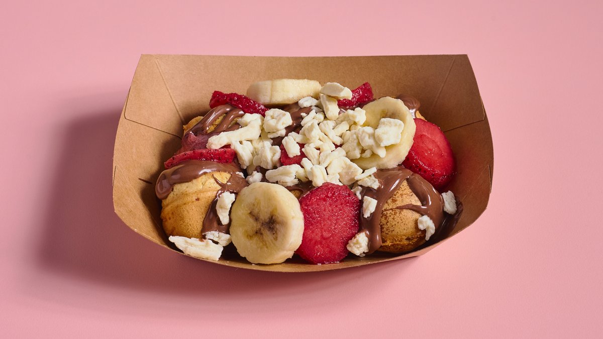 כדורי פנקייק, נוטלה, תותים, בננות ומקופלת לבנה