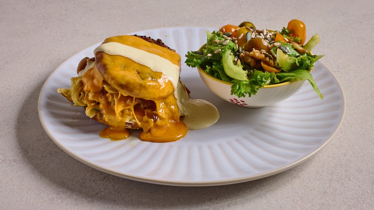 שמנת, סלמון מעושן, ביצה עלומה, רוטב הולנדייז, פרמז׳ן ועירית