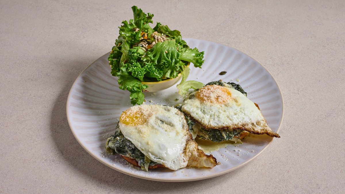 מנגולד, שמנת, ביצת עין על לחמניית בריוש תוצרת הבית