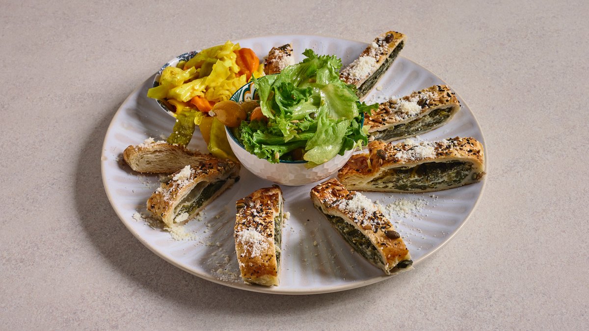 מאפה מבצק פריך עם תרד, שמנת, גאודה ומוצרלה