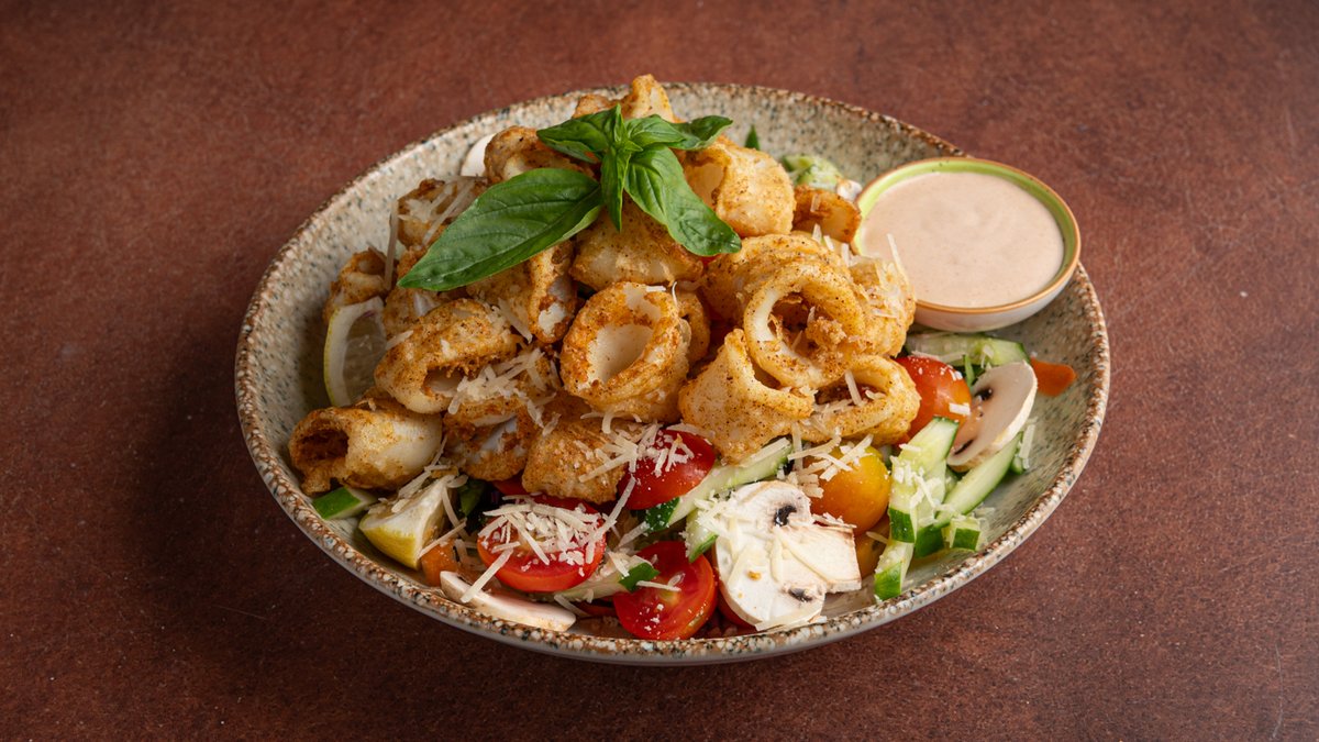 עגבנייה, מלפפון, חסה, בצל, גזר כרוב אדום , פרמז׳ן וטבעות קלאמרי