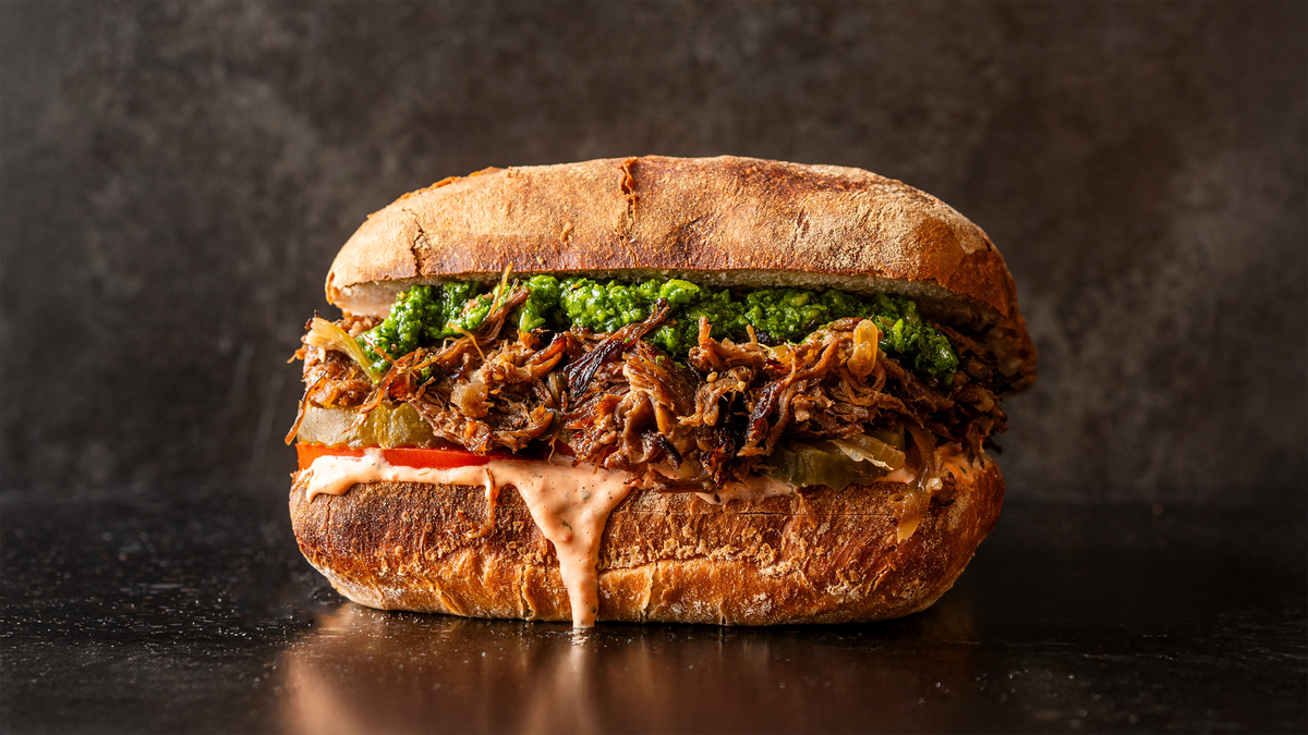 אסאדו מפורק, בצל מקורמל, צ'ימיצ'ורי ירוק, עגבניה, מלפפון חמוץ | מוגש עם איולי פלפלים