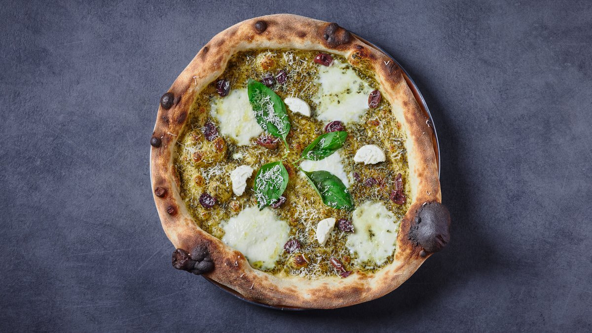 רוטב פסטו, מוצרלה, גבינת עיזים וזיתי קלמטה