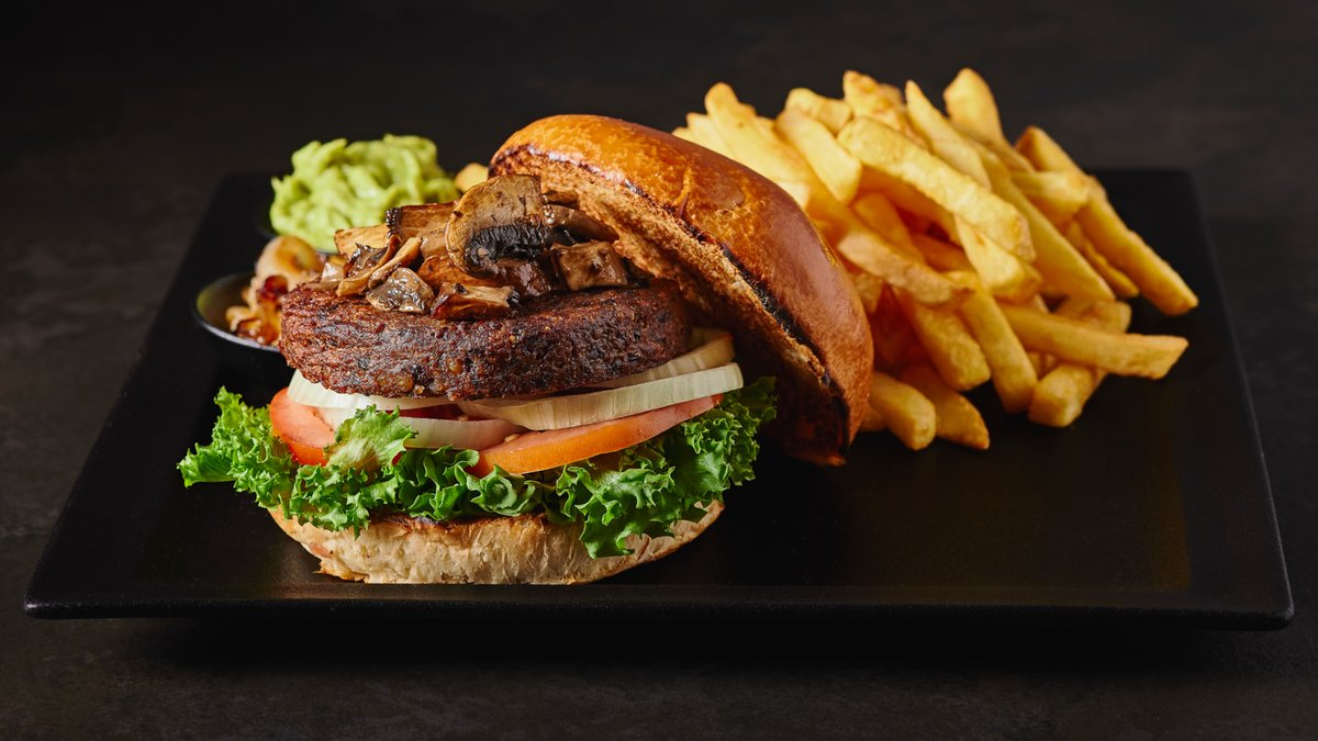 קציצת בורגר מכוסמת, מש מונבט, אורז מלא וצ'יה מוגש עם חסה, עגבניה, בצל וחמוצים. מוגש עם צ׳יפס ושתיה לבחירה