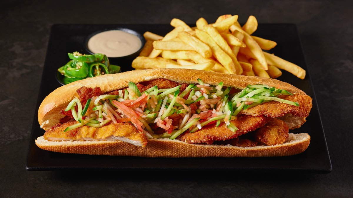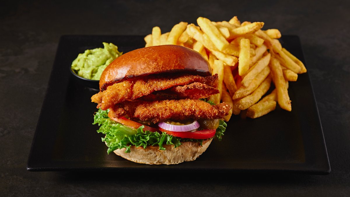 שניצל דק קריספי בלחמניית המבורגר מוגש עם תוספת ושתיה לבחירה