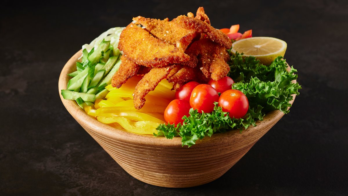 רצועות שניצל, חסה, מלפפון, גזר, כרוב לבן, גמבה צבעונית ועגבניות שרי