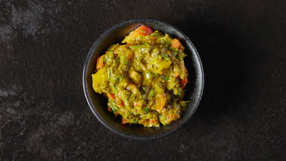 רצועות אנטריקוט, חסה, מלפפון, גזר, כרוב לבן, גמבה צבעונית ועגבניות שרי המנה יכולה להיות מעט פיקנטית