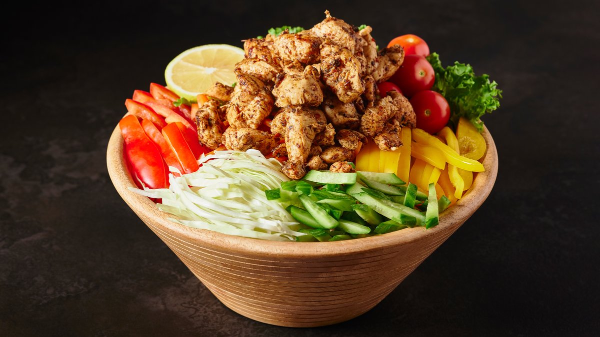 רצועות חזה עוף, חסה, מלפפון, גזר, כרוב לבן, גמבה צבעונית ועגבניות שרי