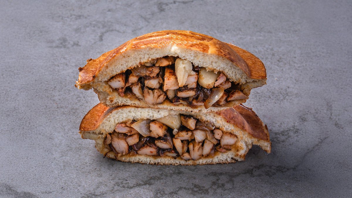 קציצת המבורגר, איולי כמהין, צ׳דר טבעוני ובצל מקורמל