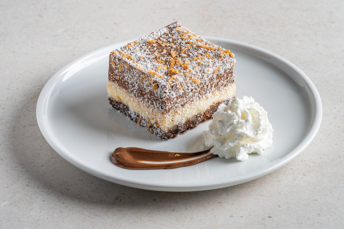 תחתית בראוניז, שכבת קוקוס ומוס שוקולד. מוגש ללא קצפת