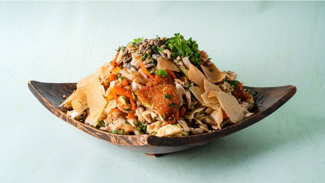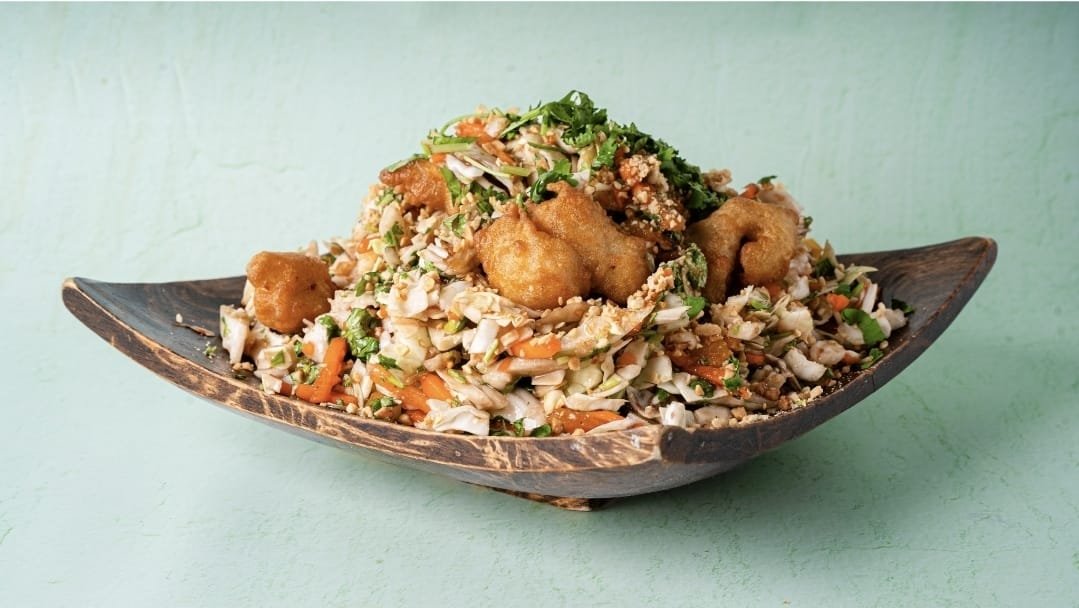 סלט בניחוח אינדונזי, עם גזר, כרוב, פלפלים, שברי וונטון, גרעינים פריכים ובוטנים ברוטב הבית המנה מוגשת עם כוסברה ובוטנים מעל (ניתן להוריד)