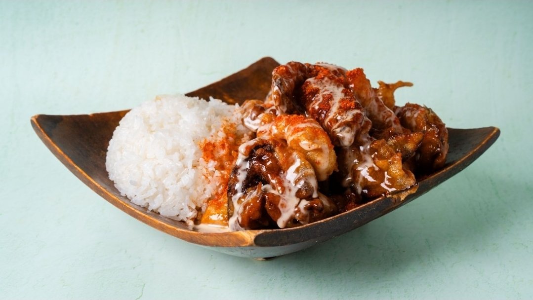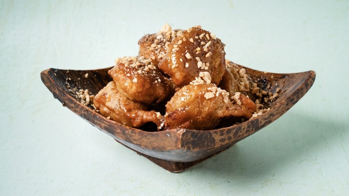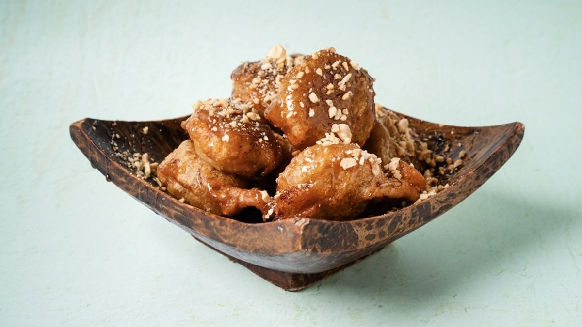 כנפיים קריספיות מצופות בפירורי פנקו. המנה מוגשת עם כוסברה ובוטנים מעל (ניתן להוריד). ניתן להוסיף מגוון רטבים בצד