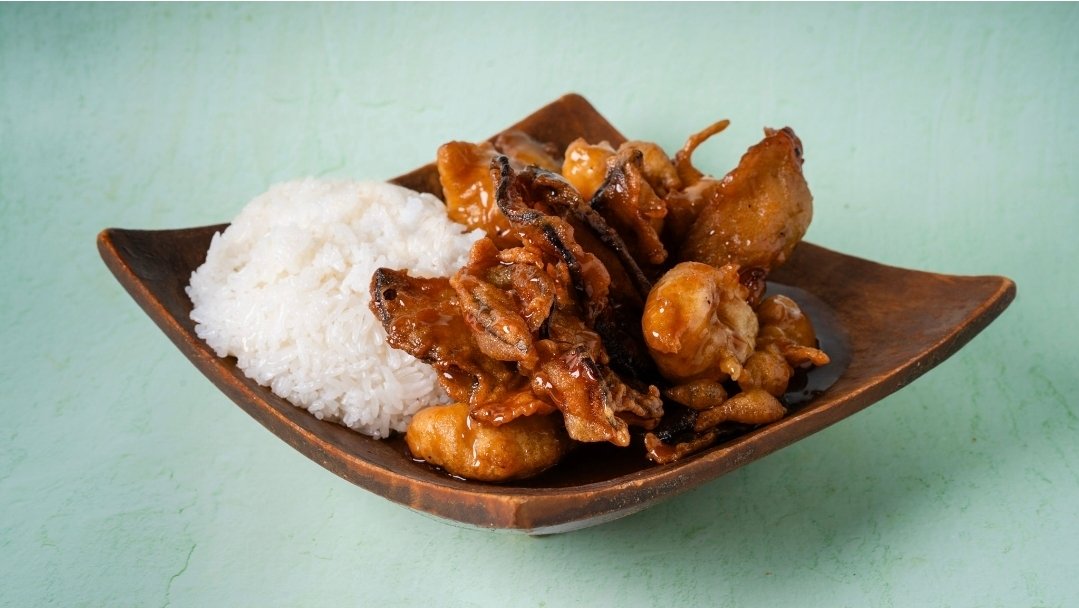 חצילים פריכים בטמפורה קריספית, מוקפצים ברוטב טריאקי. המנה מוגשת עם כוסברה ובוטנים מעל (ניתן להוריד) ניתן להוסיף מגוון רטבים בצד