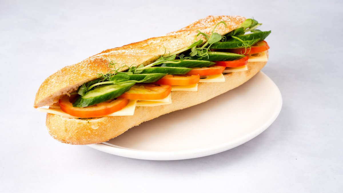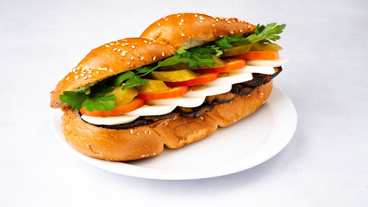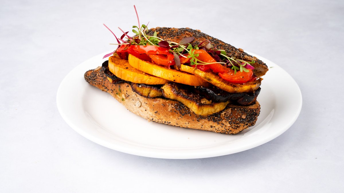 לחמניית כוסמין דגנים, ממרח פסטו, חציל, פלפלים קלויים, בטטה, עגבנייה ומלפפון