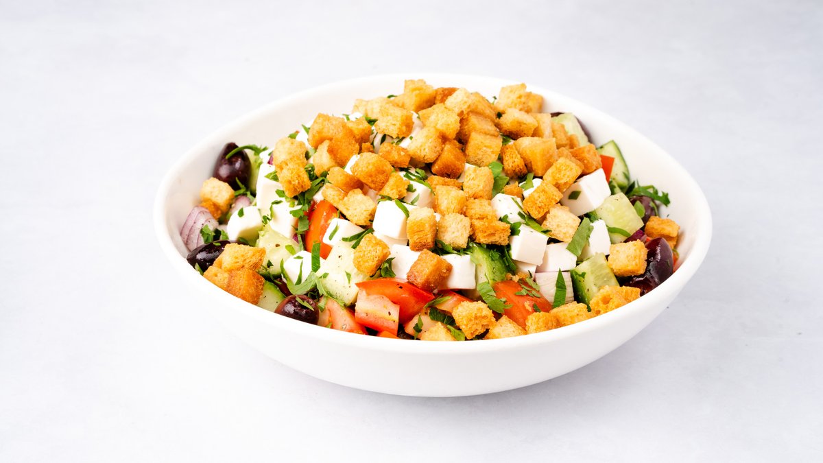 ירקות בחיתוך גס, עגבניה, מלפפון, בצל סגול, זיתי קלמטה, פטרוזיליה, גבינה מלוחה וקרוטונים, ברוטב שמן זית ולימון