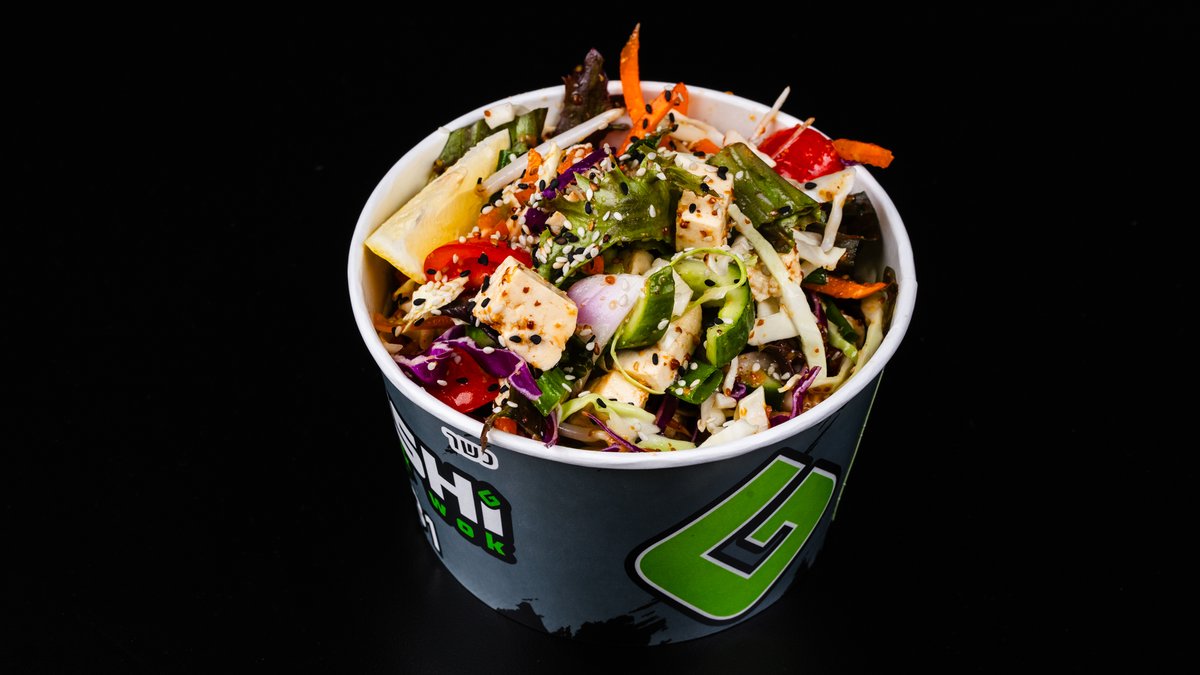 חסה, כרוב לבן, מלפפון, עגבניות שרי, בצל, גזר וחזה עוף מוגש ברוטב לבחירה