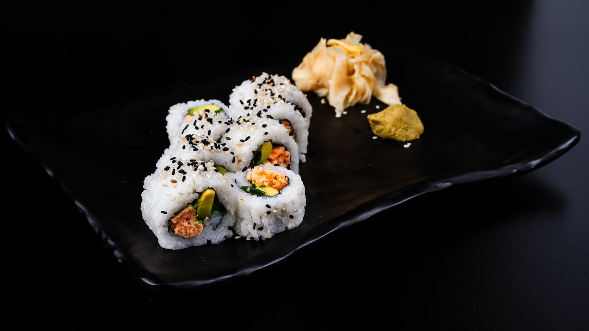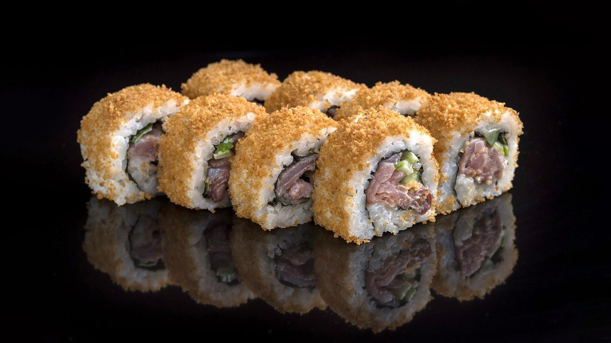 רול חם מטוגן בטמפורה במילוי סלמון אפוי, מלפפון וגז