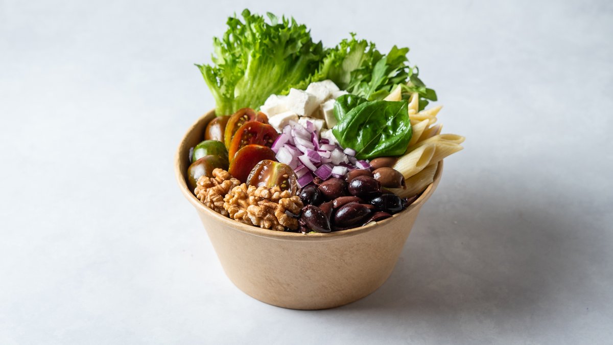 פסטה, שמן זית, חסה, עלי רוקט, מיקס עגבניות שרי, זיתי, קלמטה, בזיליקום, בצל סגול, אגוזי מלך/שקדים פרוסים קלויים, בולגרית ורוטב ויניגרט חרדל