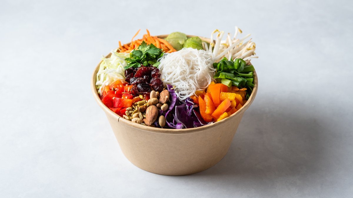 אטריות אורז, נבטים, כרוב לבן, כרוב סגול, בצל ירוק, כוסברה, פטרוזיליה, גזר ג'וליאן, שומשום קלוי, חמוציות, מיקס פלפלים רוטב מומלץ אסייתי