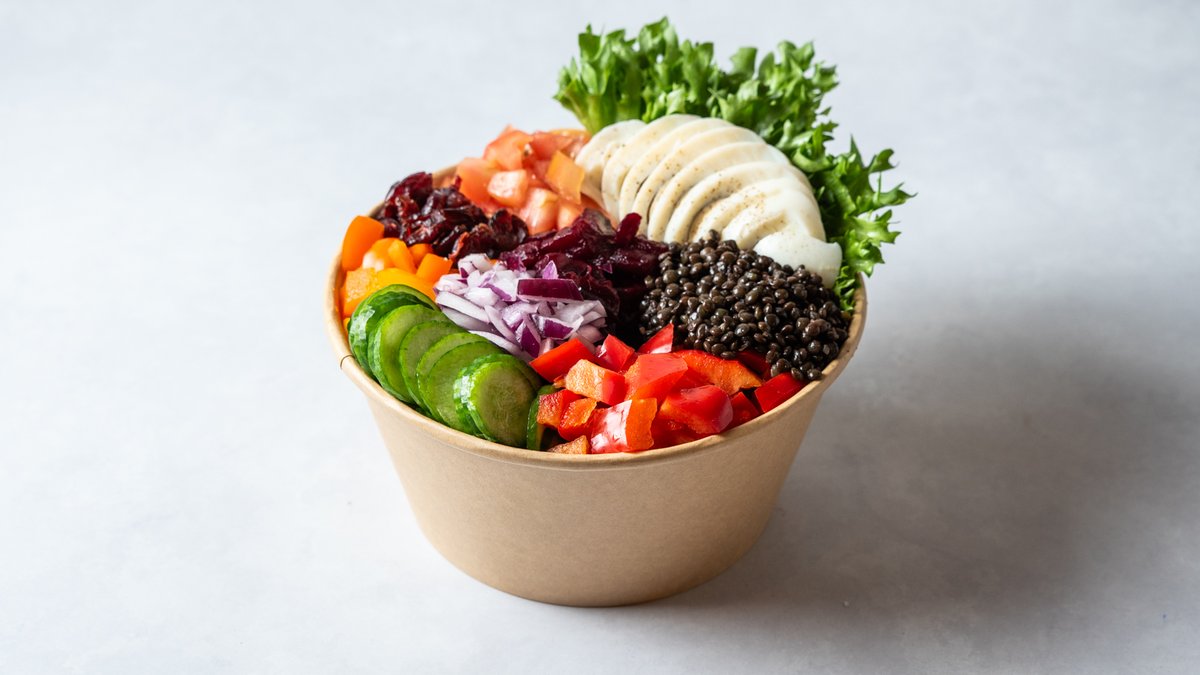 עדשים שחורות, עגבניות, מלפפון, חסה, בצל סגול, פלפל אדום, פלפל צהוב, סלק, , חמוציות, ג'עלה לסלט, ביצה רטבים מומלצים רוטב שמן זית ולימון, וינגרט שורשים