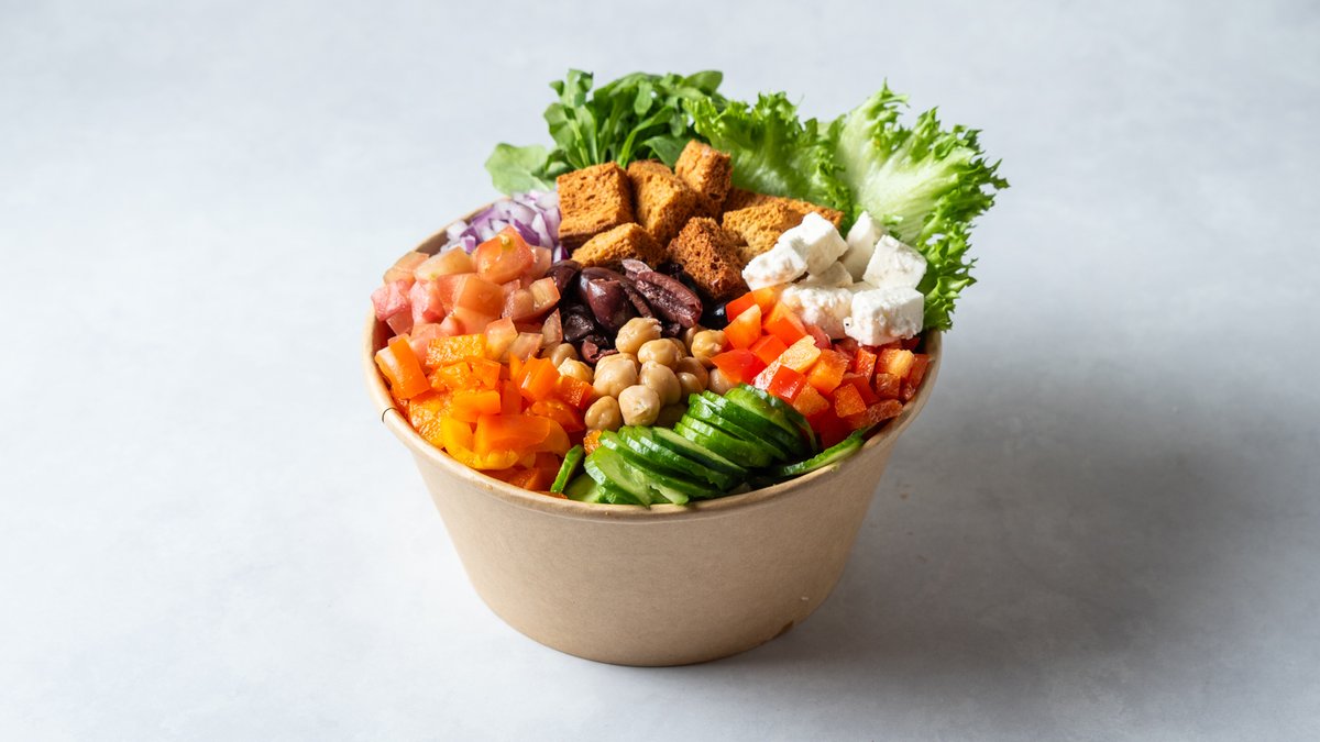 עלי בייבי, חסה, מלפפון, עגבניה, בצל סגול, גרגירי חומוס, פלפל צהוב, פלפל אדום, זיתי קלמטה, קרוטוני , בולגרית מעודנת עם רוטב לבחירה