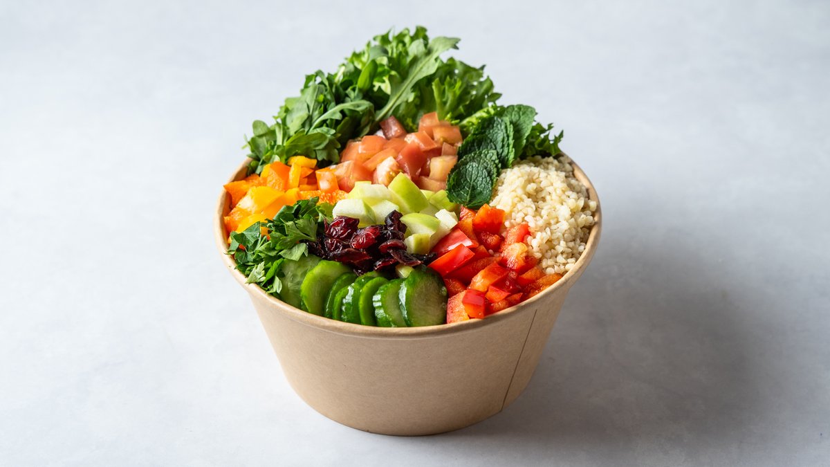 בורגול רגיל, חסה ,עלי בייבי עגבניה, מלפפון, בצל, פלפל אדום, פלפל צהוב, פטרוזילה, נענע, תפוח עץ