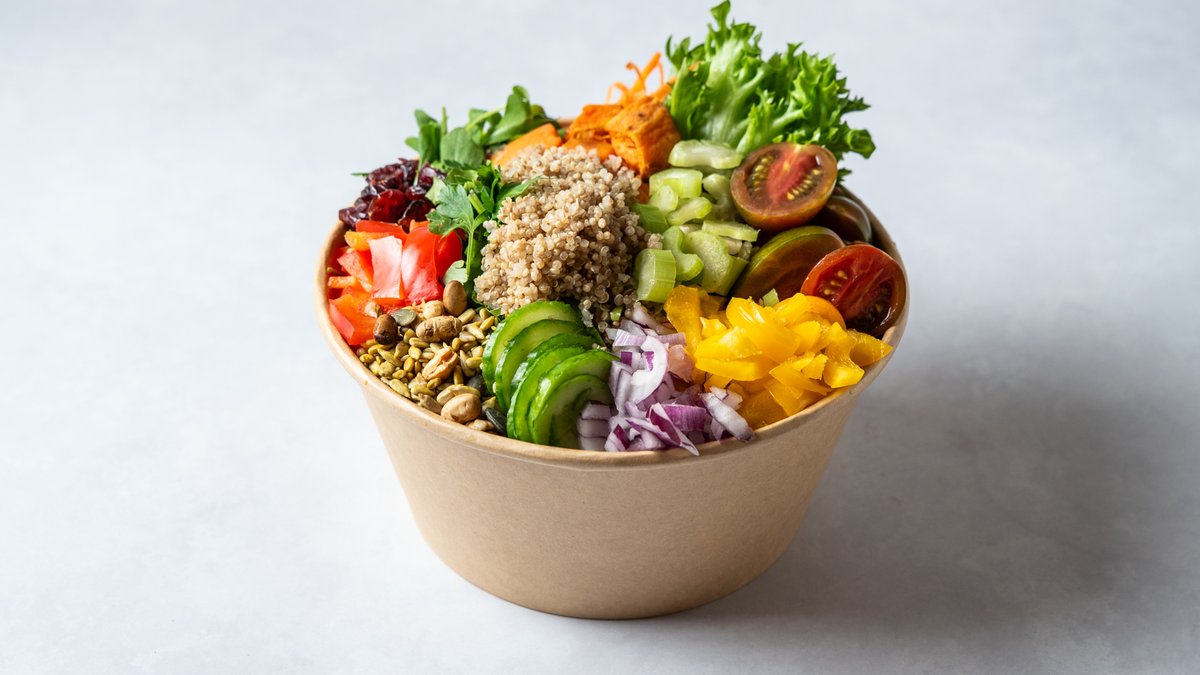 מיקס קינואה, חסה , מלפפון, עגבניות שרי, בצל סגול, בטטה, סלרי, פלפל אדום, פלפל צהוב, גזר ג'וליאן, פטרוזוליה, חמוציות, ומיקס גרעינים בריא