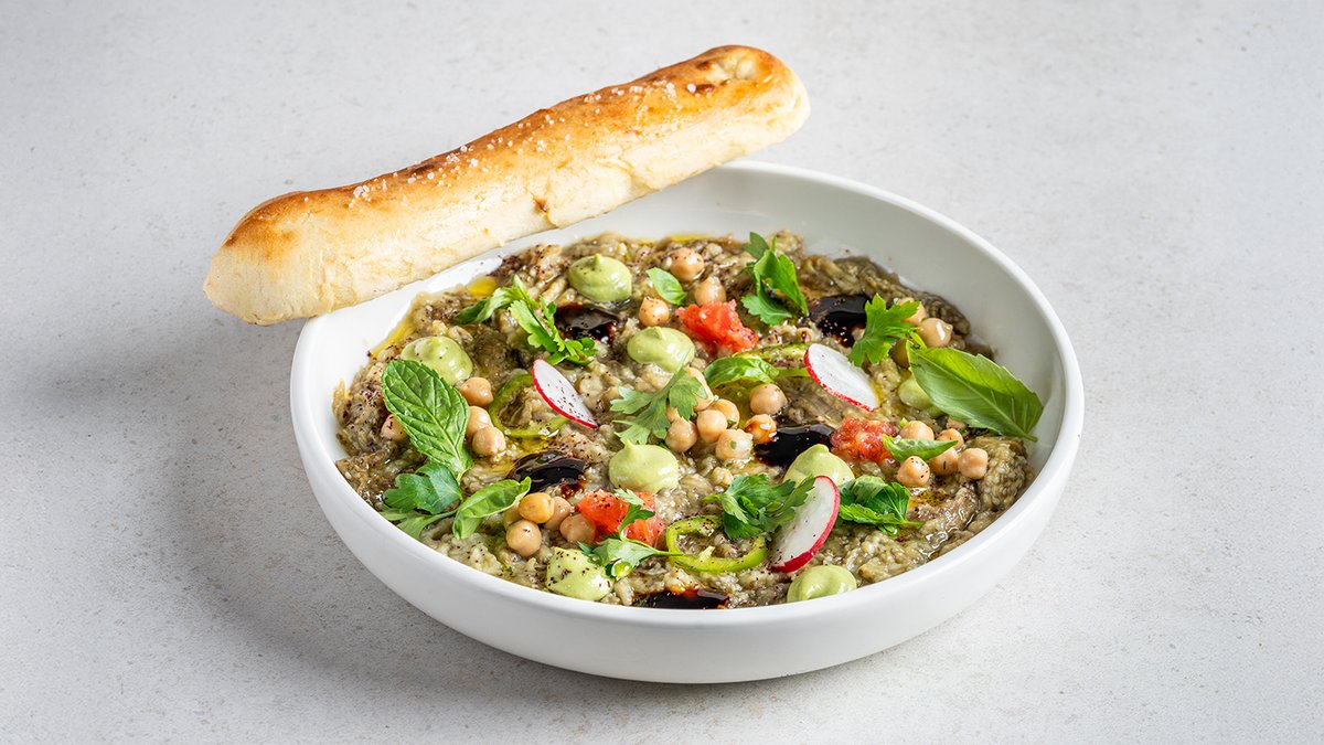 חציל שרוף, טחינה ירוקה, צנונית, סלסת עגבניות, צ'ילי ירוק, עלים ירוקים, גרגירי חומוס בתיבול פטרוזיליה שום ולימון, בלסמי מצומצם וסומק, מוגש עם פוקצ'ינה.