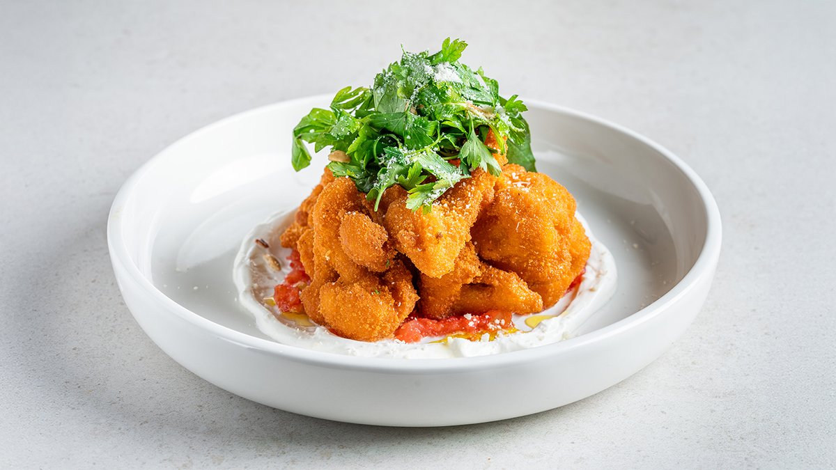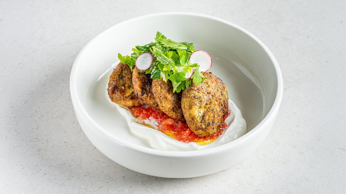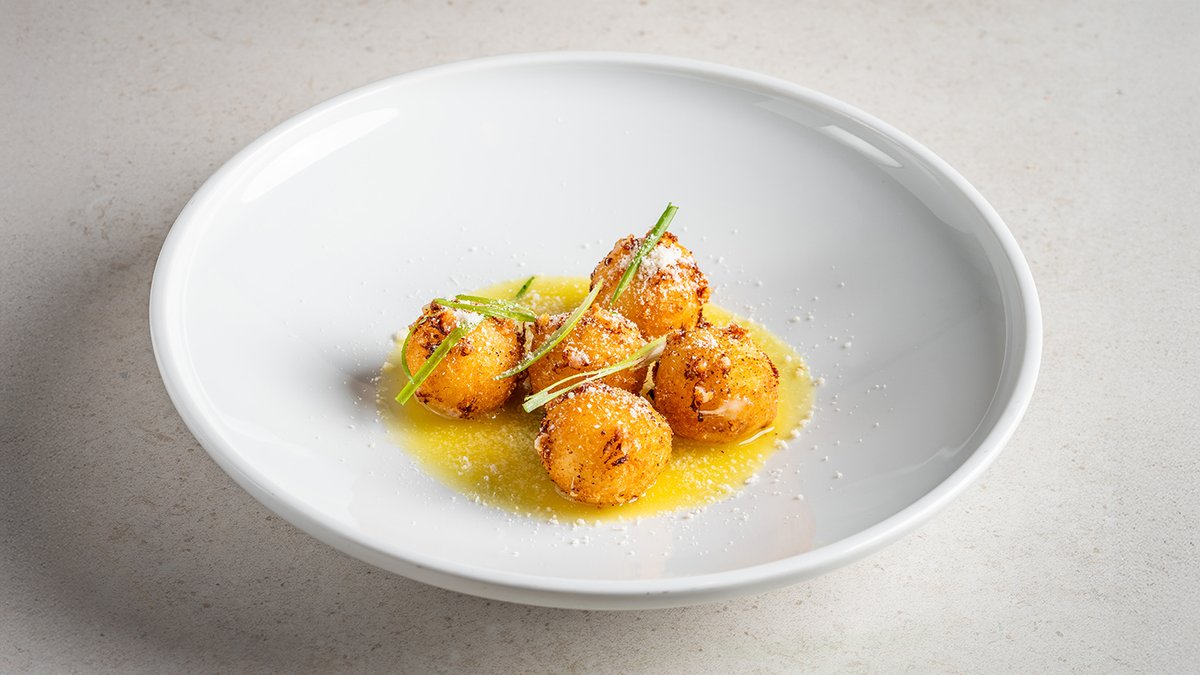 כדורי ריקוטה מוצרלה ופרמז'ן בציפוי פנקו מונחים על רוטב חמאה לימונית ובצל ירוק.