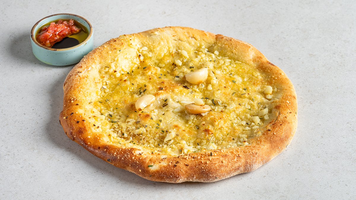 בצק אפוי בתנור אבן, שום קונפי ופרמז'ן. מוגש לצד סלסת עגבניות, חומץ בלסמי ושמן זית.