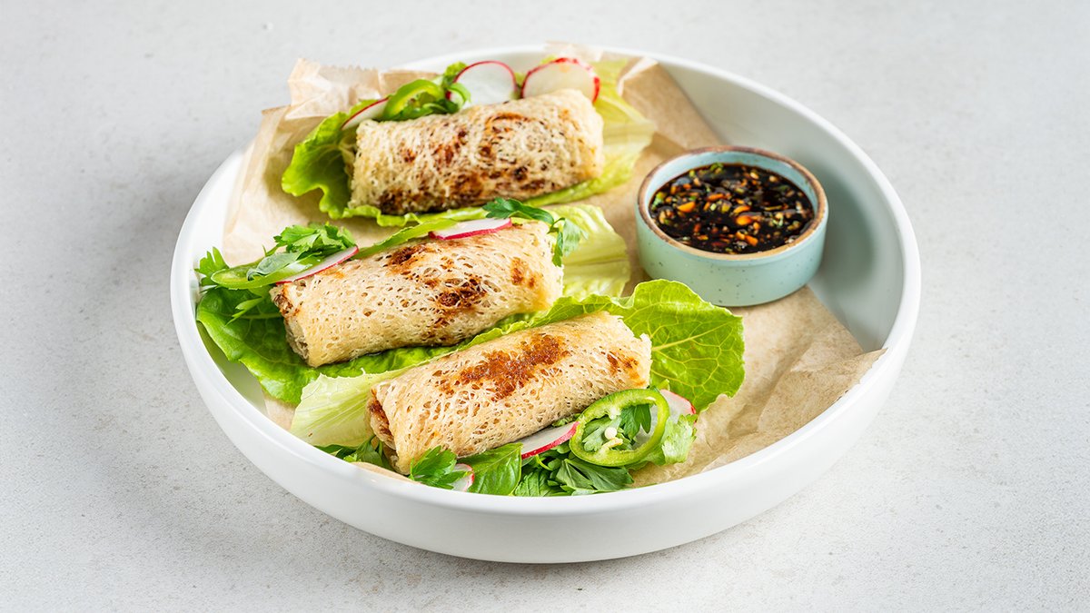רול קריספי ממולא בירקות מונח בעלה חסה, צ'ילי ירוק, צנונית ועלים ירוקים, לצד רוטב וייטנאמי.