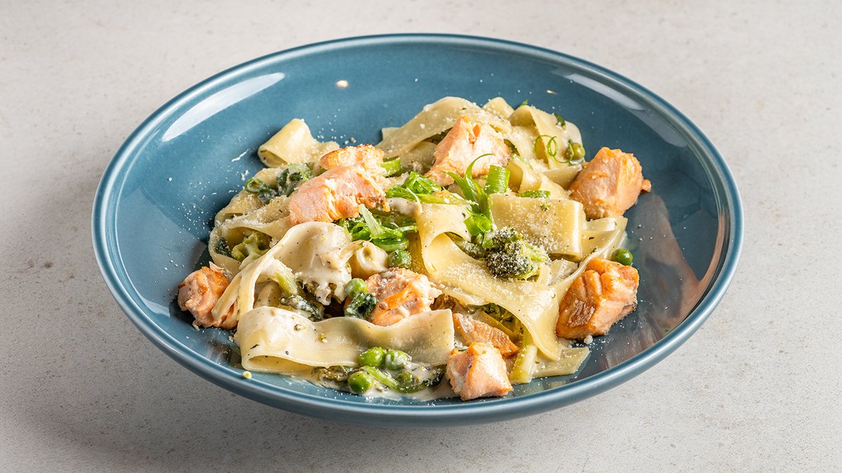 קוביות סלמון, פפרדלה, ציר ירקות, רוטב אלפרדו, חמאת שום, ברוקולי, תרד, אפונה ושעועית ירוקה. - לנוהגי היתר.