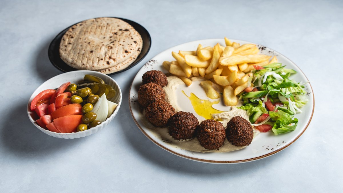 פלאפל פריך וטעים, חומוס ביתי, טחינה קרמית, צ'יפס זהוב, סלט ירקות אישי 2 פיתות וירקות חתוכים גס