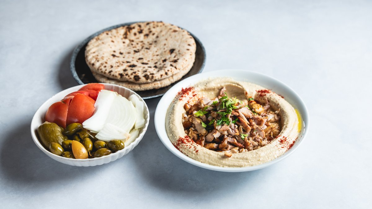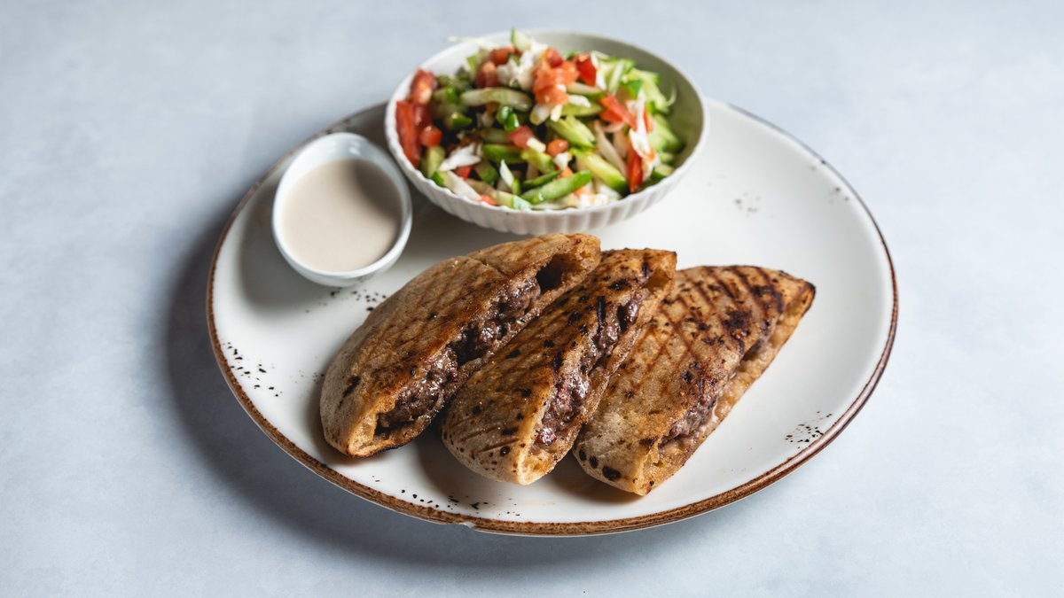 פיתה במילוי בשר מתובל וצלוי מוגש עם טחינה וסלט ירקות אישי