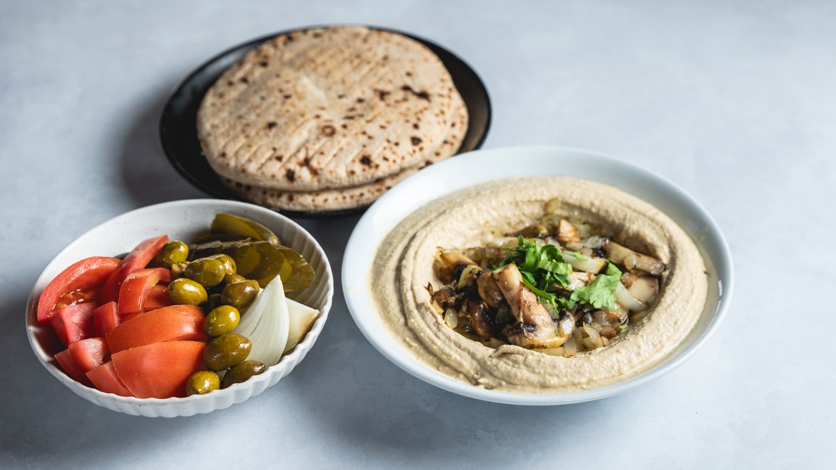 חומוס ביתי עם בצל מטוגן זהוב ופטריות מוגש עם 2 פיתות וירקות חתוכים גס