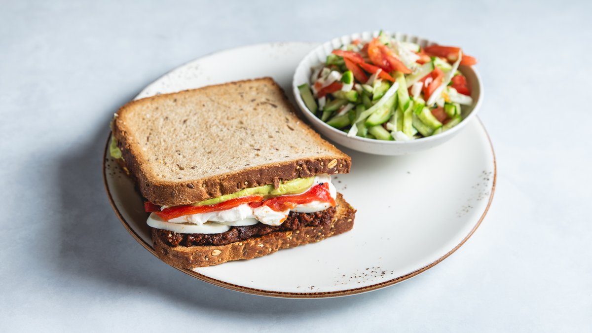 ממרח אבוקדו קרמי, גבינת שמנת, פלפל קלוי מתוק, ביצה קשה ועגבניות מיובשות בלחם קסטן דגנים מוגש עם סלט ירקות אישי רענן