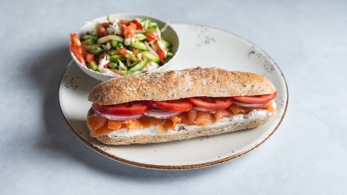 סלמון מעושן, גבינת שמנת קרמית, עגבנייה טרייה ובצל דק מוגש עם סלט ירקות אישי רענן