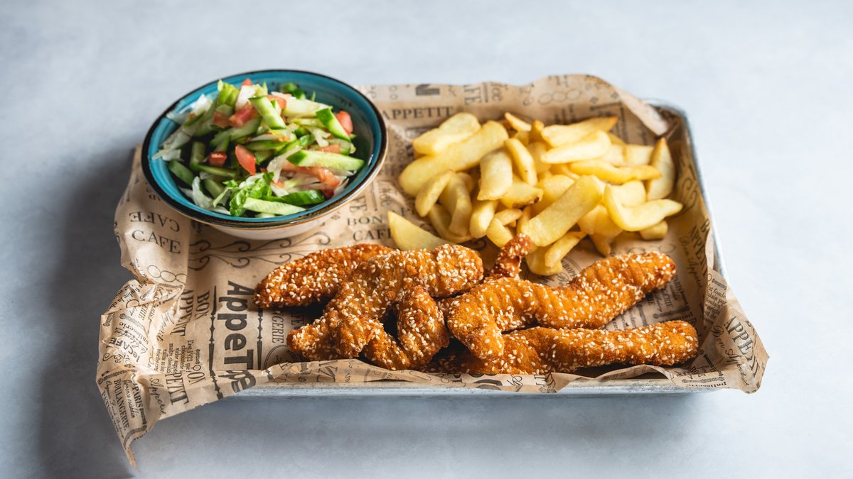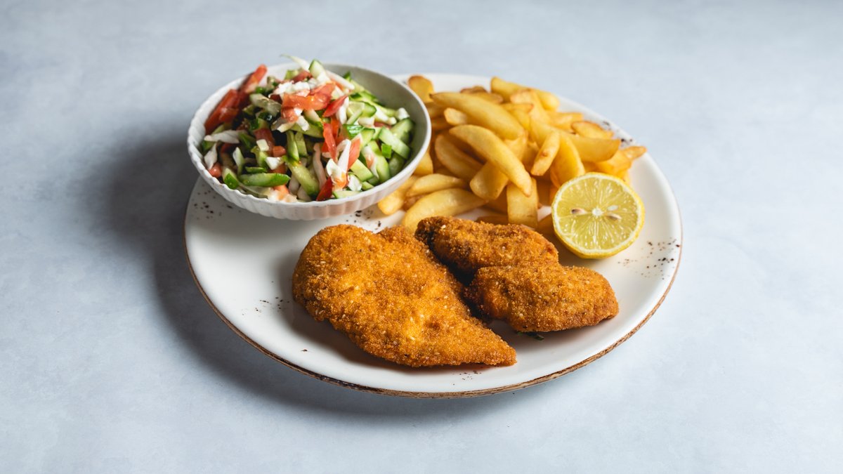 נתחי חזה עוף עסיסיים בציפוי פריך מוגש עם תוספת לבחירה