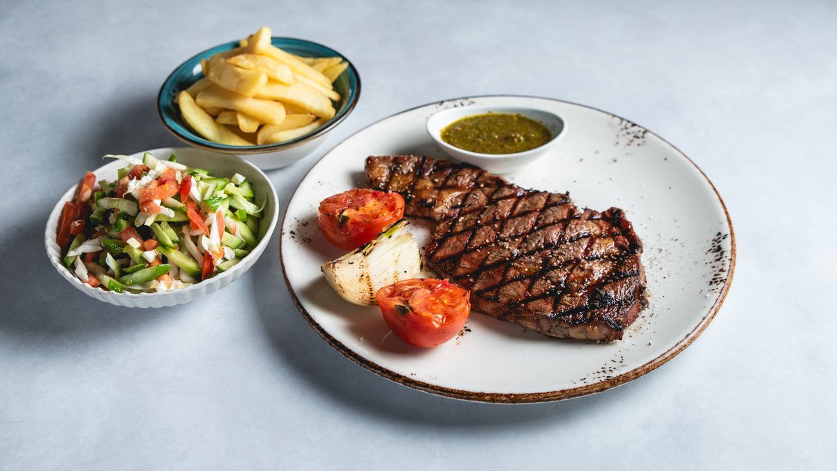 סטייק עגל איכותי מוגש עם סלט אישי, רוטב צ'ימיצ'ורי ארגנטינאי ותוספת לבחירה