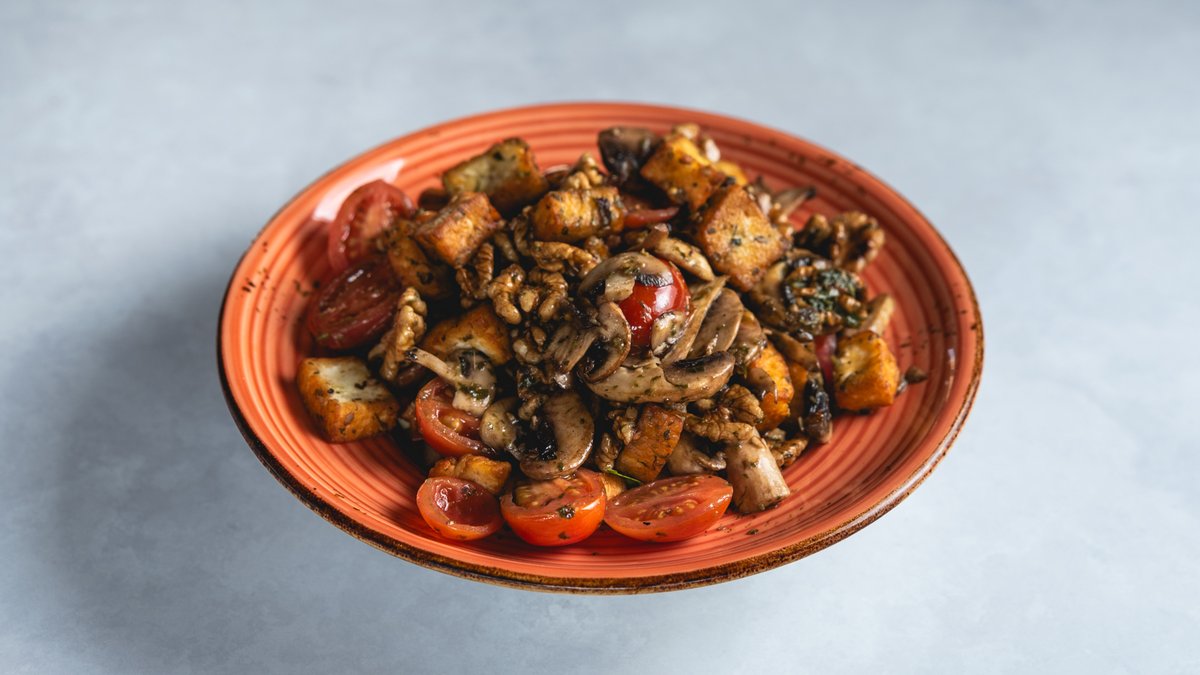 חלומי זהוב עם פטריות, עגבניות שרי, רוטב פסטו ואגוזי מלך, חסה פריכה, עגבניות ומלפפון