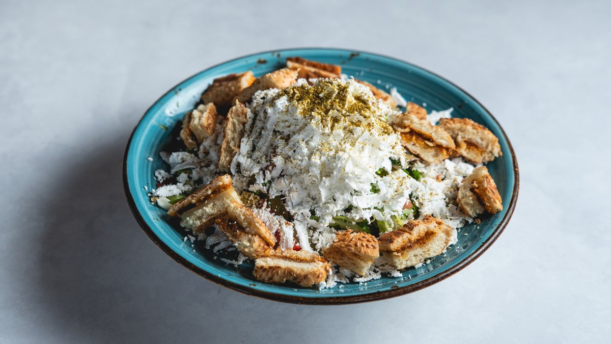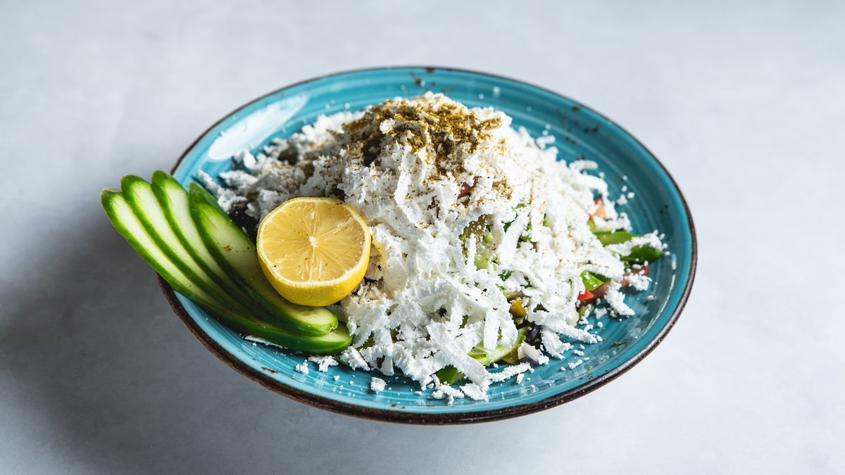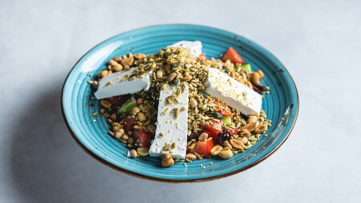 עגבניה, מלפפון, צנונית, בצל סגול, תערובת גרעיני ג׳עלה, זיתי קלמטה, גבינה בולגרית מעודנת, בצל ירוק, נענע טרייה ואורגנו קצוצים גס