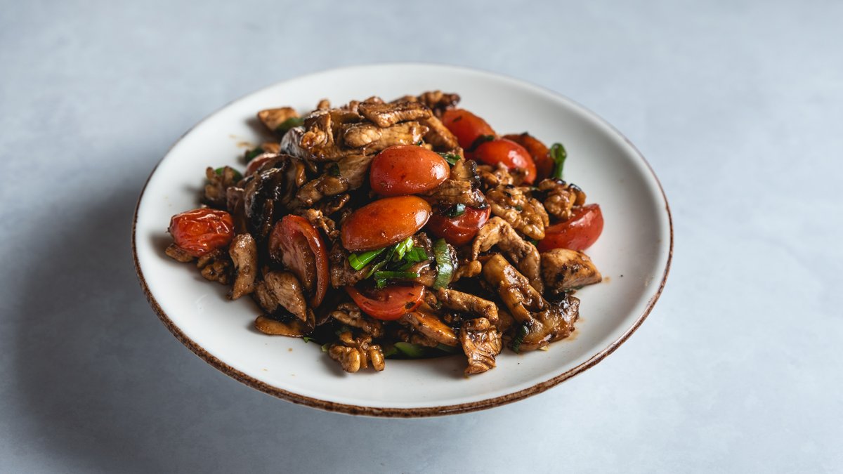 חזה עוף מוקפץ עם אגוזי מלך קלויים ברוטב טריאקי מתוק עם פטריות ארומטיות, בצל ירוק ועגבניות שרי מוגש על סלט ירקות טרי