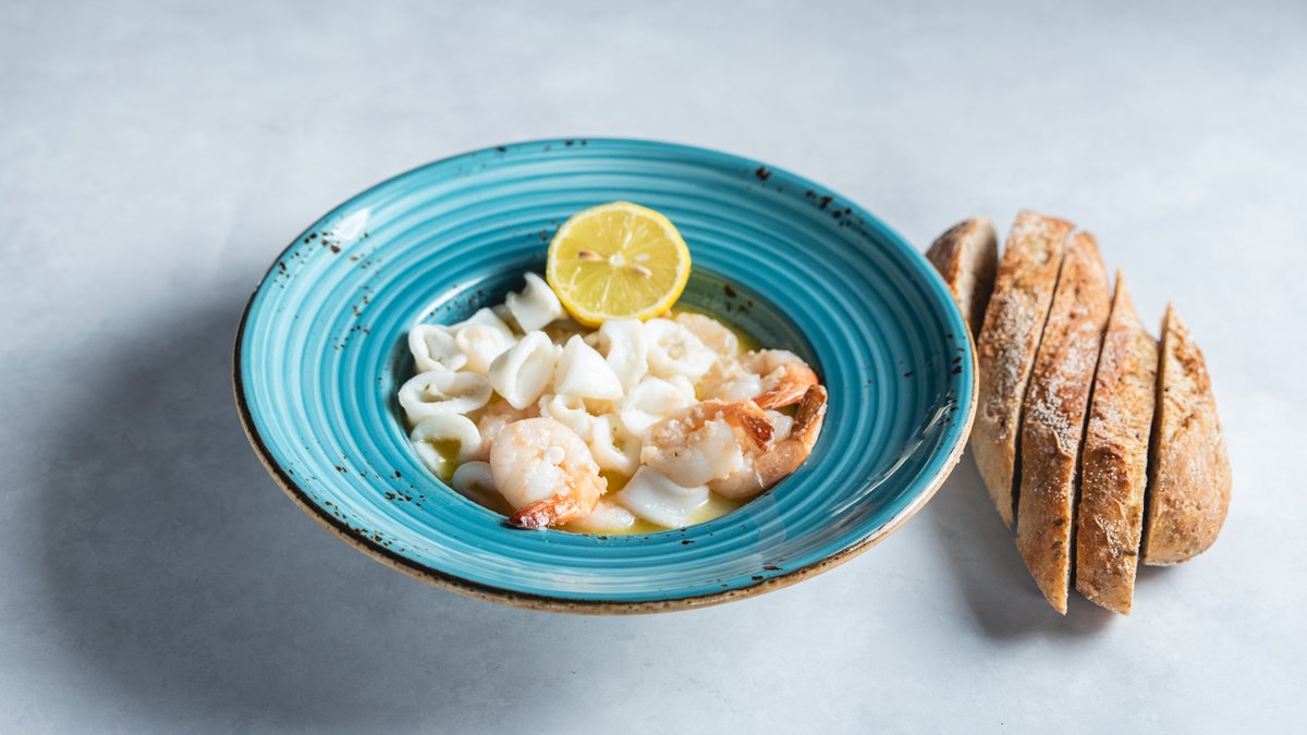 פירות ים ברוטב לבחירה מוגש עם לחם הבית