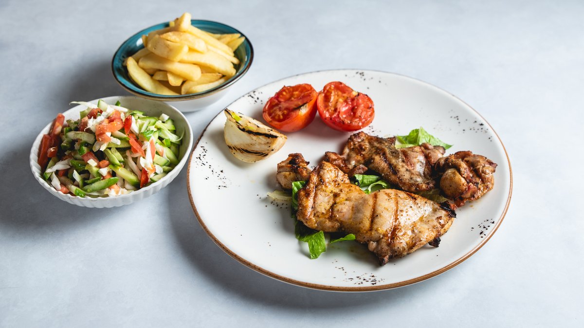פרגית בתיבול ביתי מוגש עם סלט ירקות אישי, טחינה ותוספת לבחירה