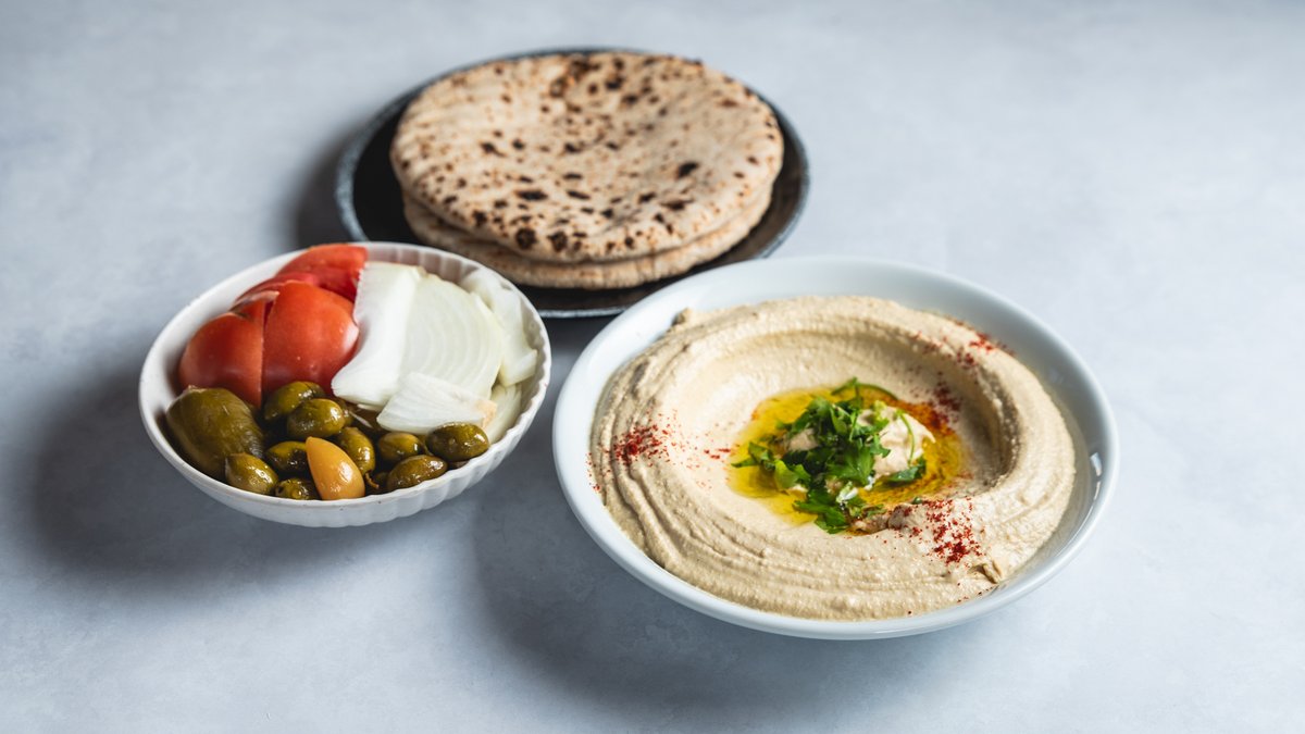 חומוס ביתי מוגש עם 2 פיתות וירקות חתוכים גס