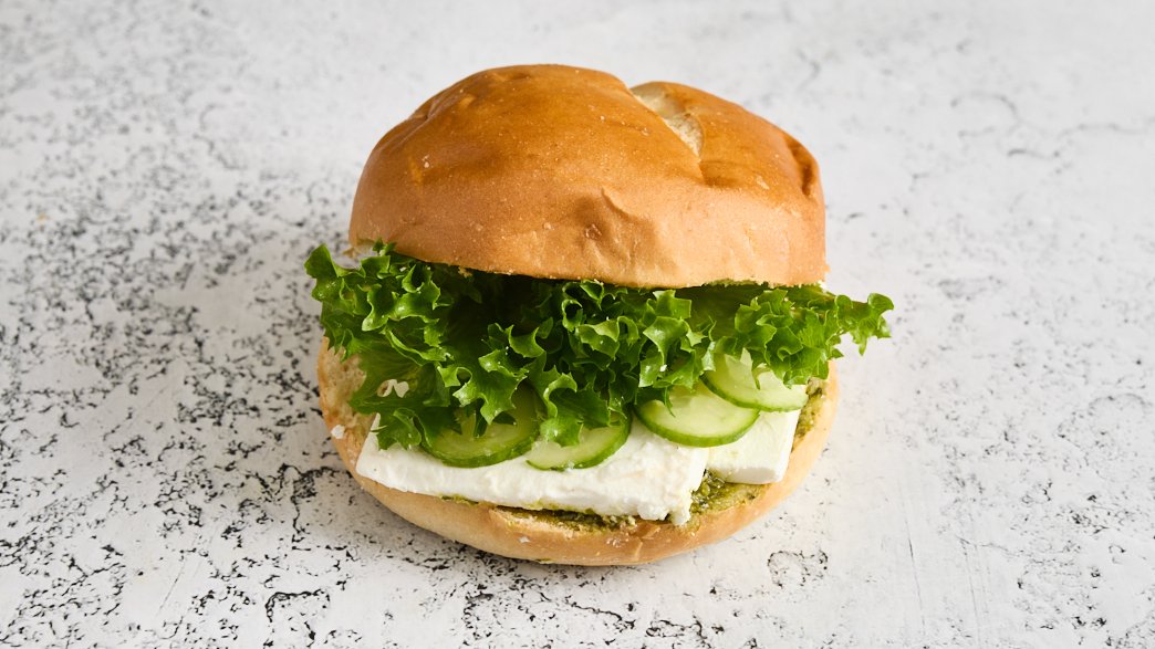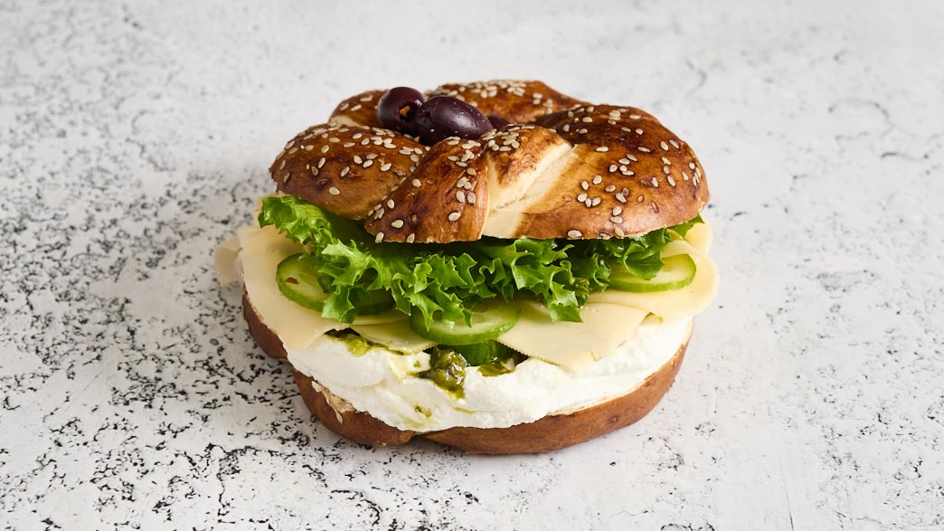 ממרח גבינת שמנת, גבינת גאודה, פסטו, חסה, עגבנייה, מלפפון ירוק