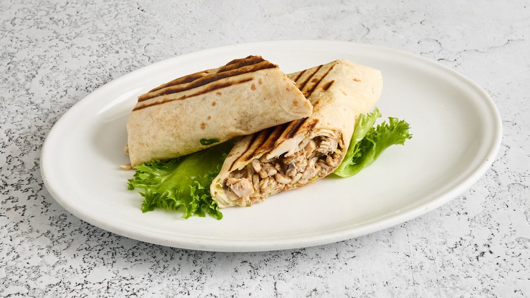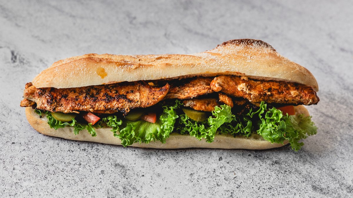חזה עוף על הפלאנצ׳ה, חסה, עגבנייה, מלפפון חמוץ ואיולי קארי . מוגש לצד תוספת צד לבחירה